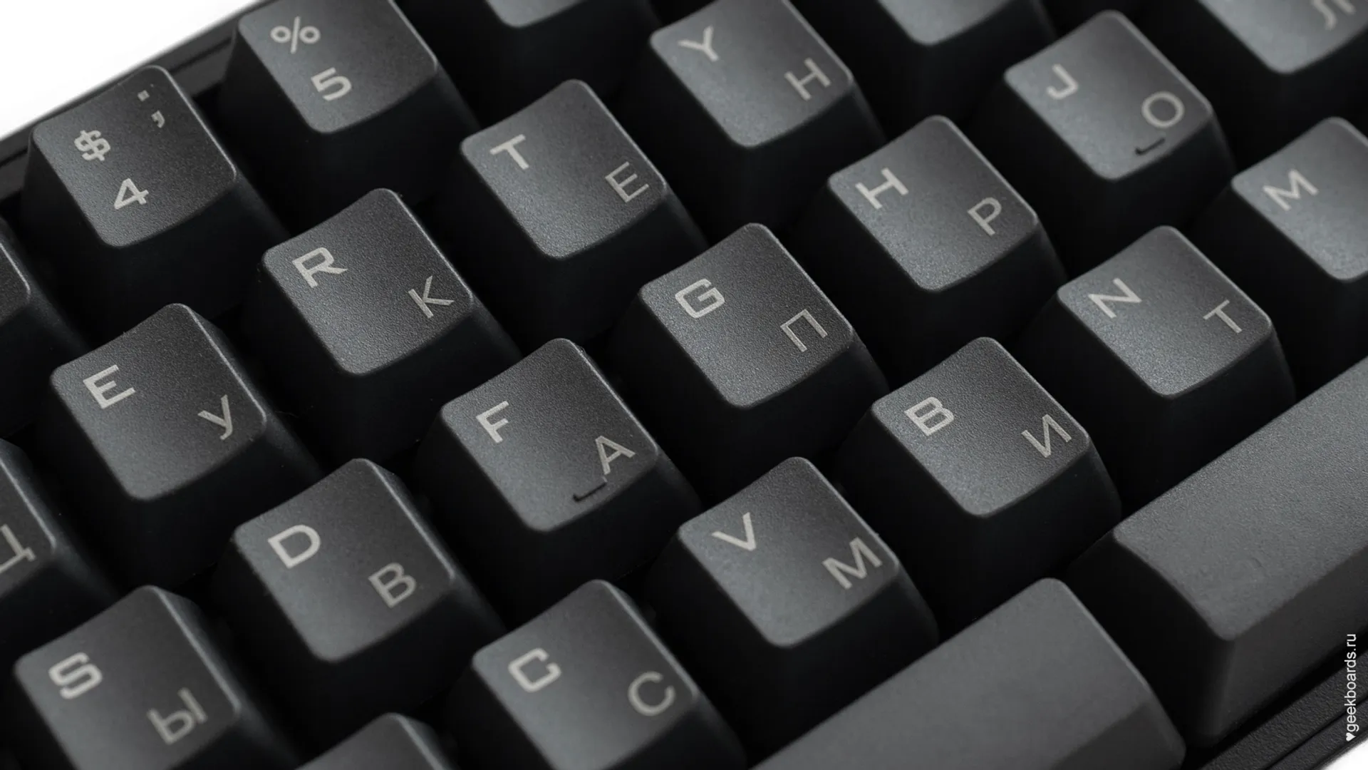 Клавиши изготовлены из высокопрочного пластика PBT с выгравированными символами. Такой пластик гарантирует надежность и долговечность, клавиши имеют слегка текстурированный верх, а выгравированные символы едва ощущаются на ощупь.