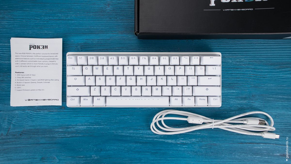 Механическая клавиатура Vortex New POK3R White RGB на переключателях Cherry MX RGB Brown. Не подошла клиенту. Были произведены следующие работы: установка стабилизаторов DUROCK Plate mount + их апгрейд. Из неприятных моментов, наличие небольших царапин на кейкапах и плейте.