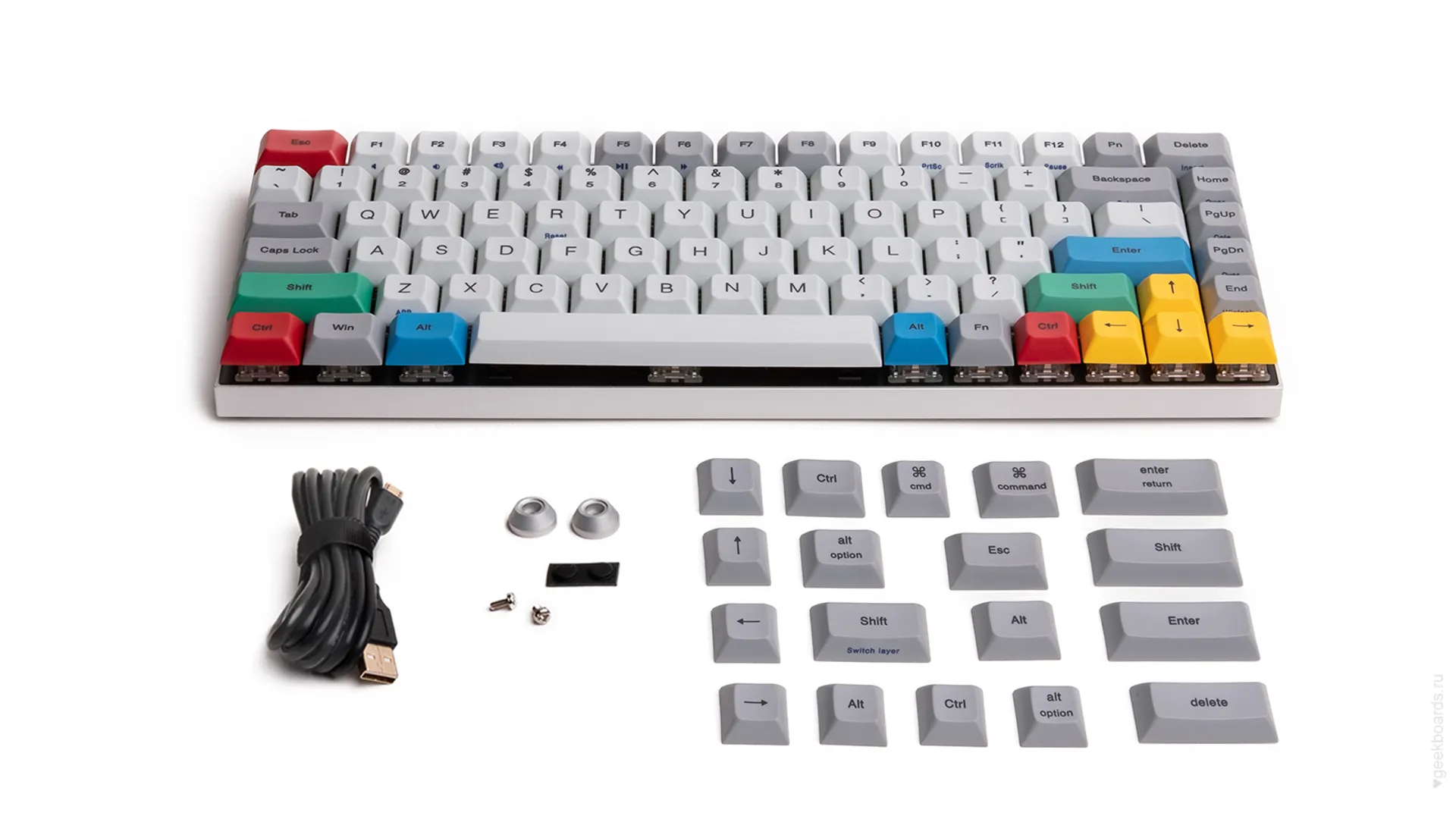 Клавиатура не использовалась, случайнно при замене кейкапа сломали переключатель на правом Shift. Починили.