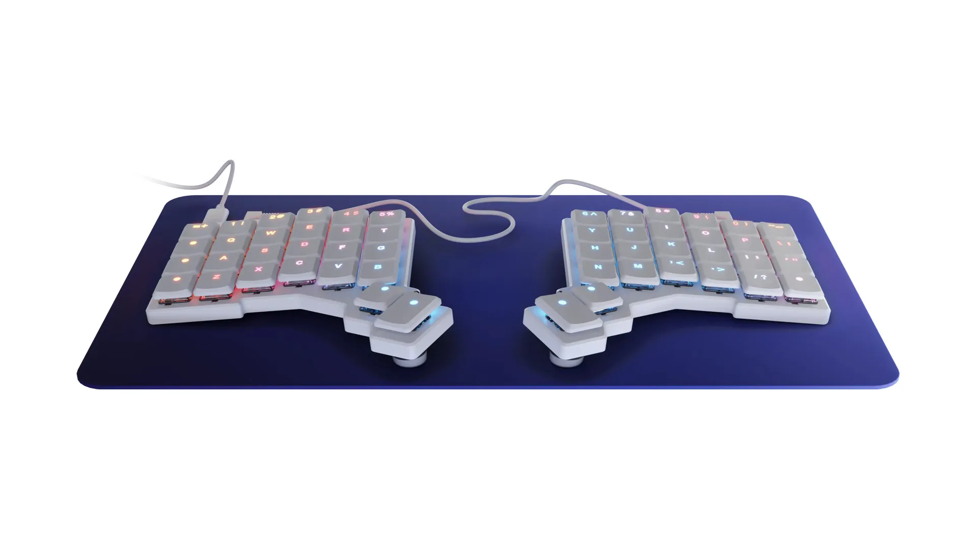 Две половины можно расположить так, как удобно именно вам — развести шире, повернуть под нужным углом или приподнять с помощью магнитных ножек. Колонночная раскладка уменьшает лишние движения пальцев, а отдельный блок под большие пальцы разгружает мизинцы и ускоряет набор.